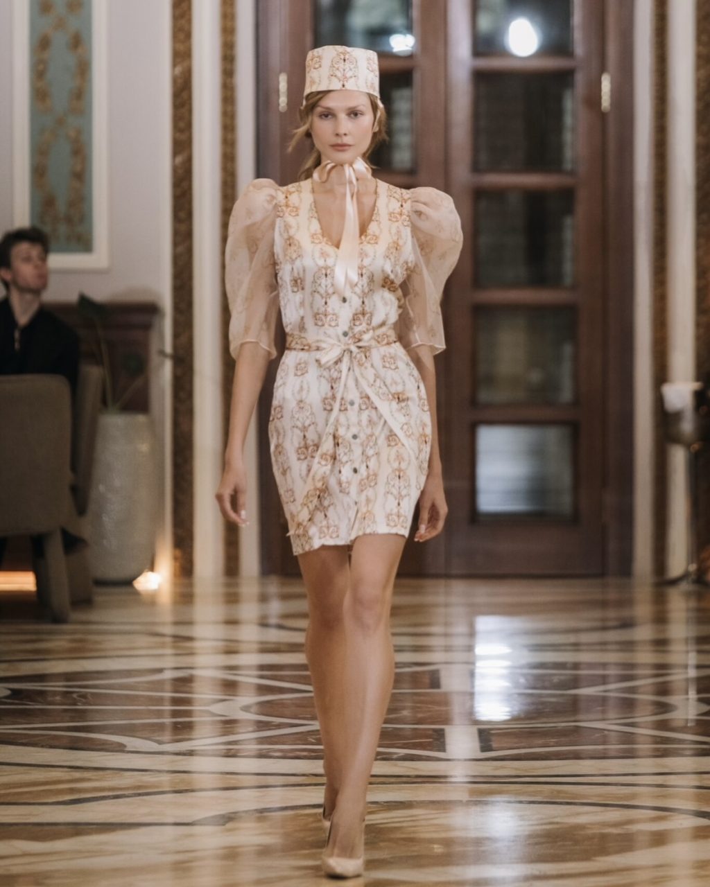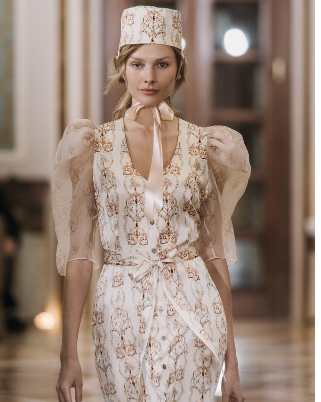 Короткое платье-халат из шелкового атласа в бежевом оттенке с деликатным барочным принтом. Приталенный силуэт с поясом подчёркивает фигуру, V-образный вырез вытягивает линию шеи, а объёмные полупрозрачные рукава из органзы добавляют лёгкости.