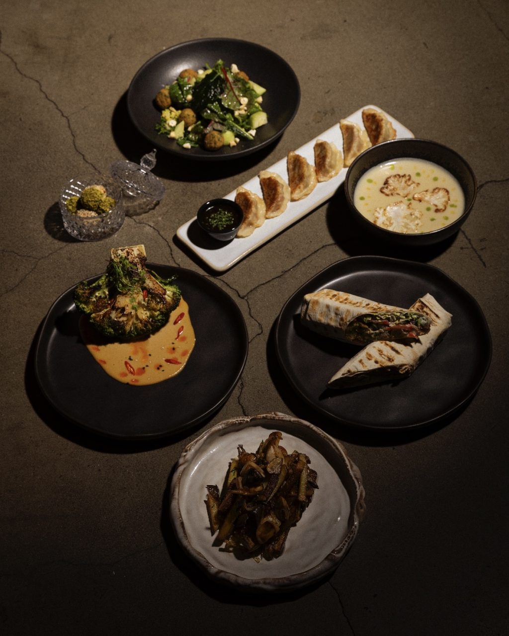 Хрустящие крокеты, нежный крем из тофу с кешью, микс салатов и брокколи. Финальный штрих — цитрусовый дрессинг с юдзу, добавляющий яркую кислотность.