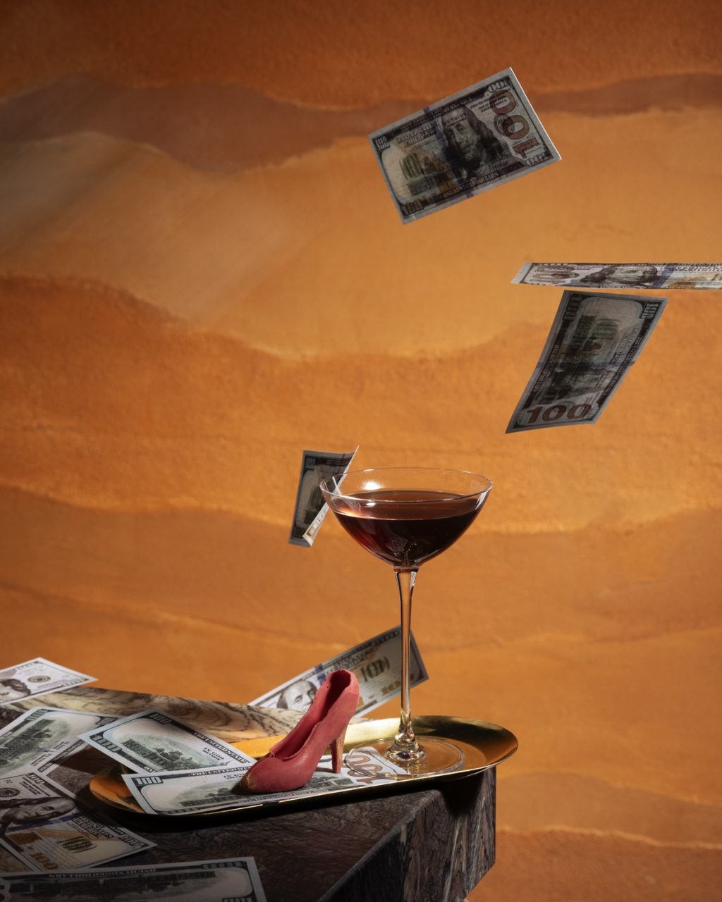 Подача: мартинка, съедобные купюры из рисовой бумаги и туфелька из глазури