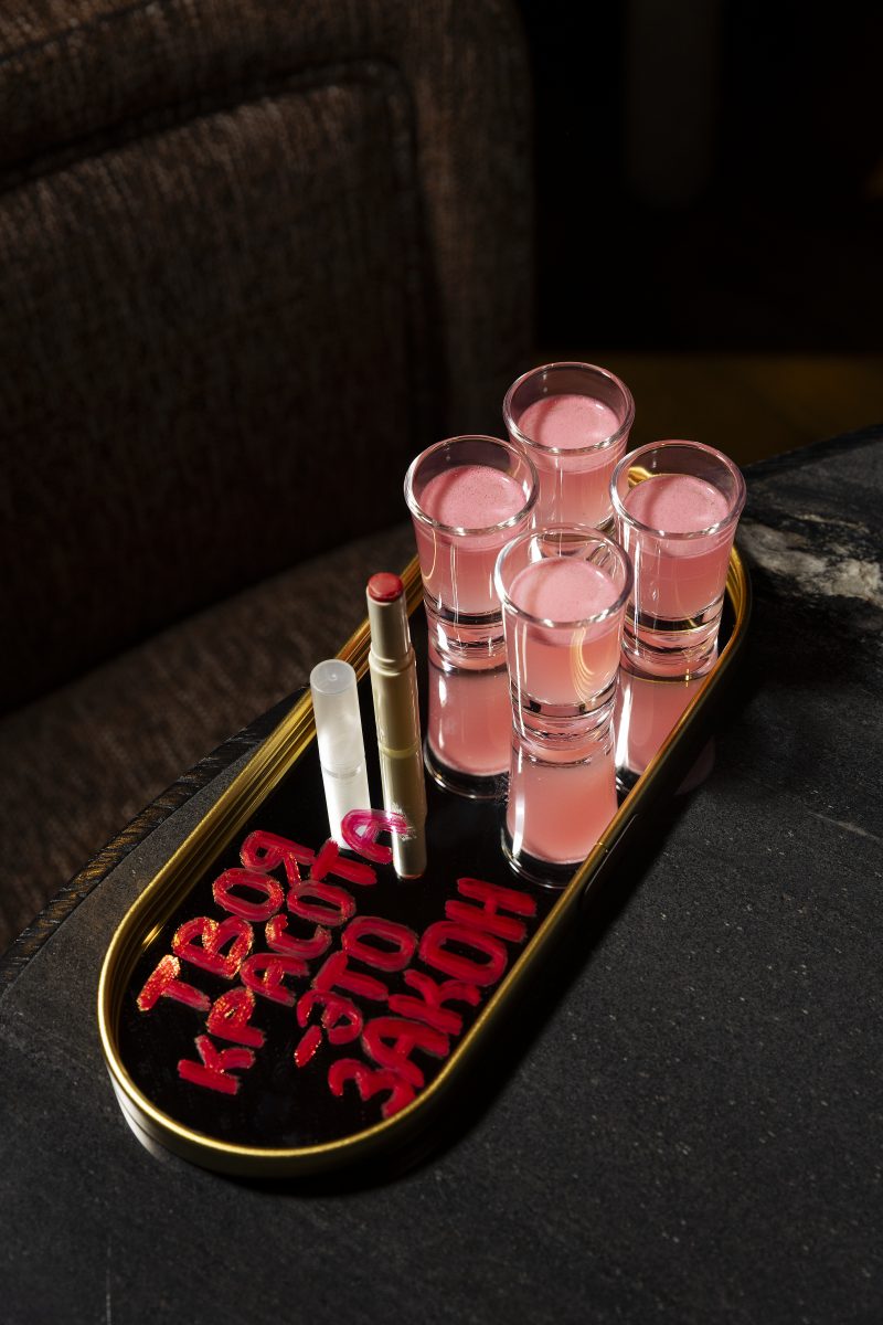 Подача: четыре шота на зеркальном подносе с цитатой о самом красивом законе и съедобной помадой