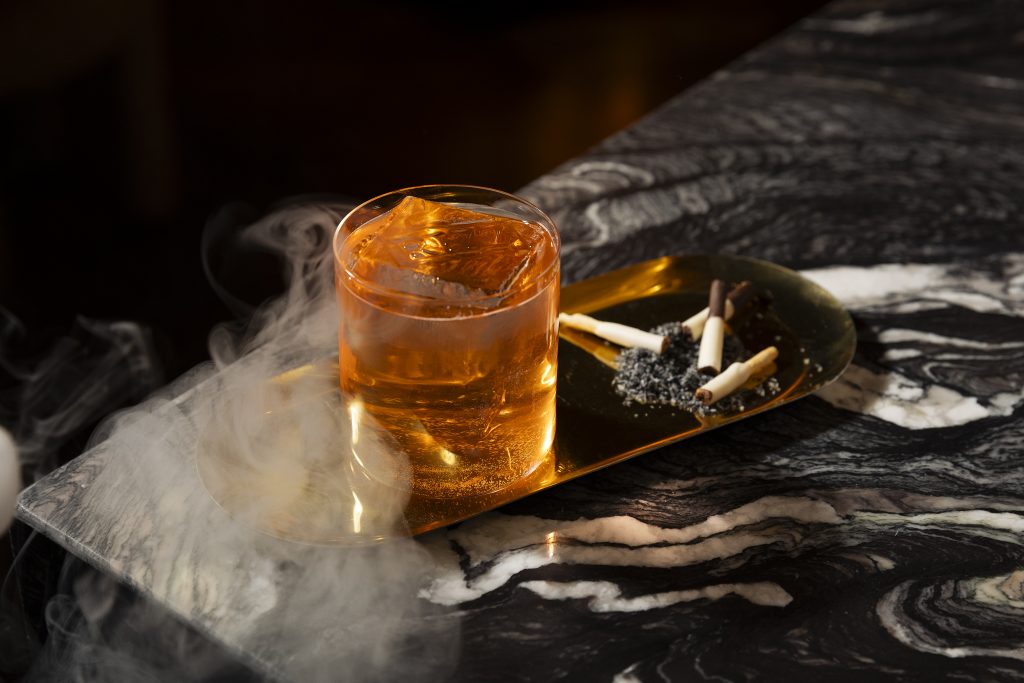 Подача: рокс, куб льда, съедобные сигареты с «пеплом» из кокосовой стружки на золотом подносе