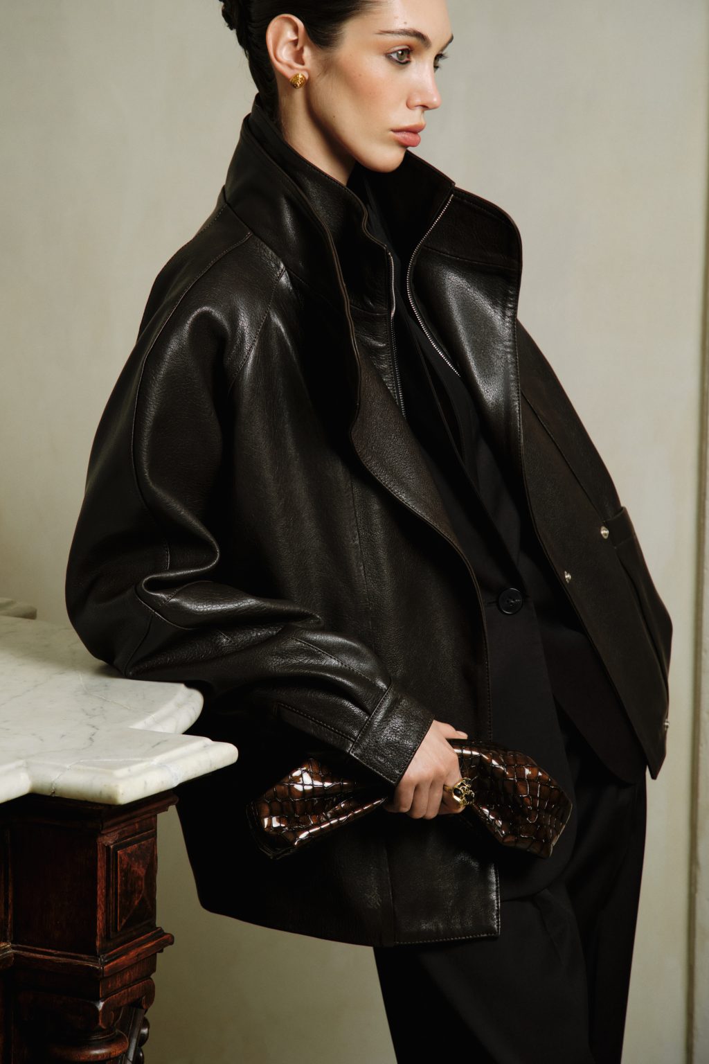 В центре внимания — верхняя одежда, как главный носитель состояния. Объемный бомбер Amber, замшевый пиджак Truffle и тактильные куртки из плотного хлопка с бархатистой фактурой создают баланс между функциональностью и выразительностью. Они не просто защищают от переменчивой погоды — они собирают образ, удерживая внутреннюю целостность.