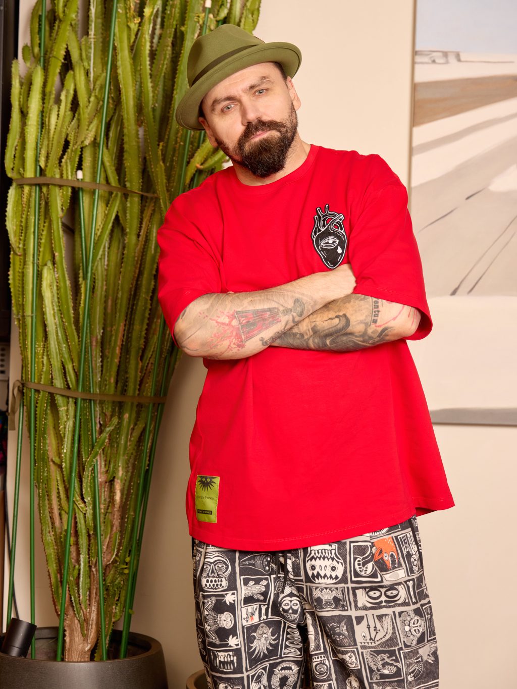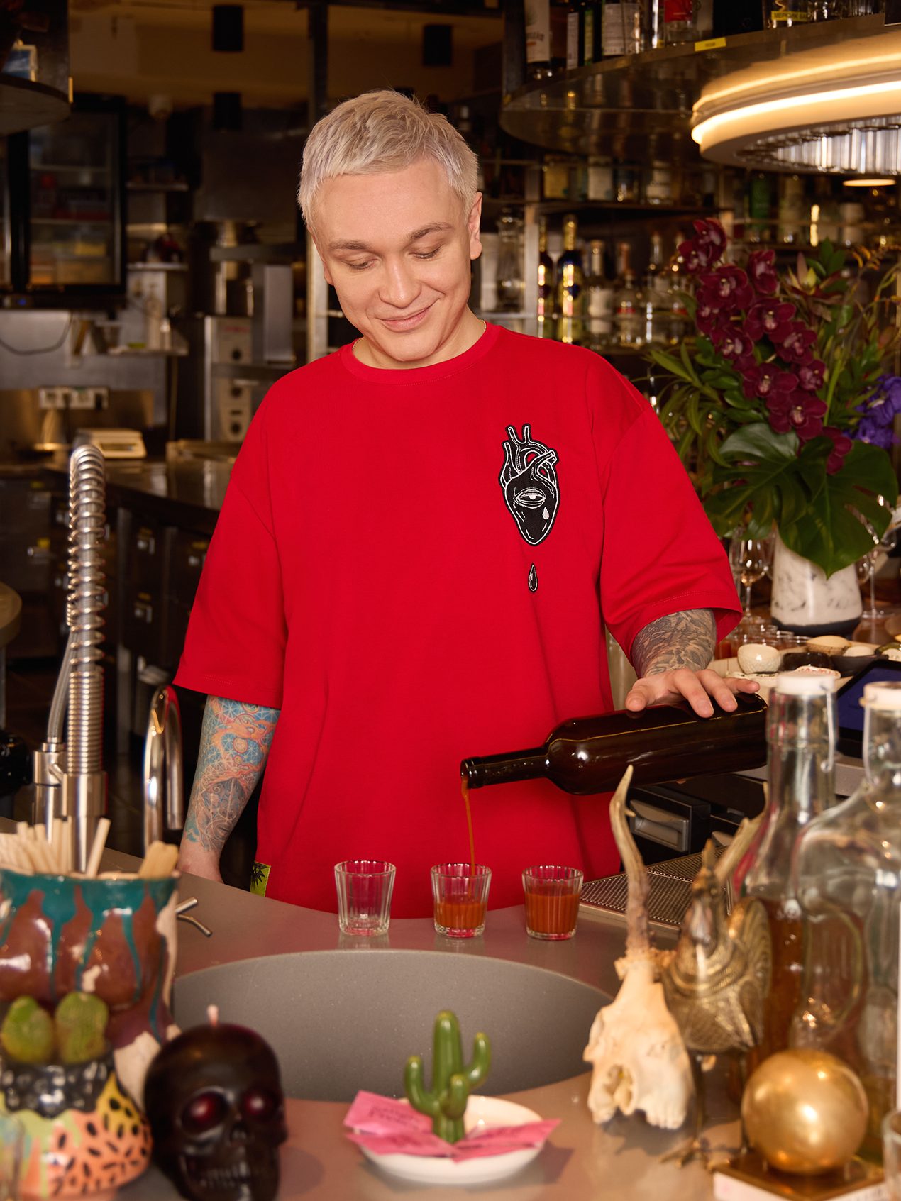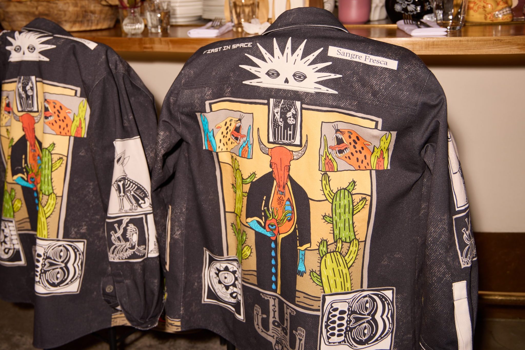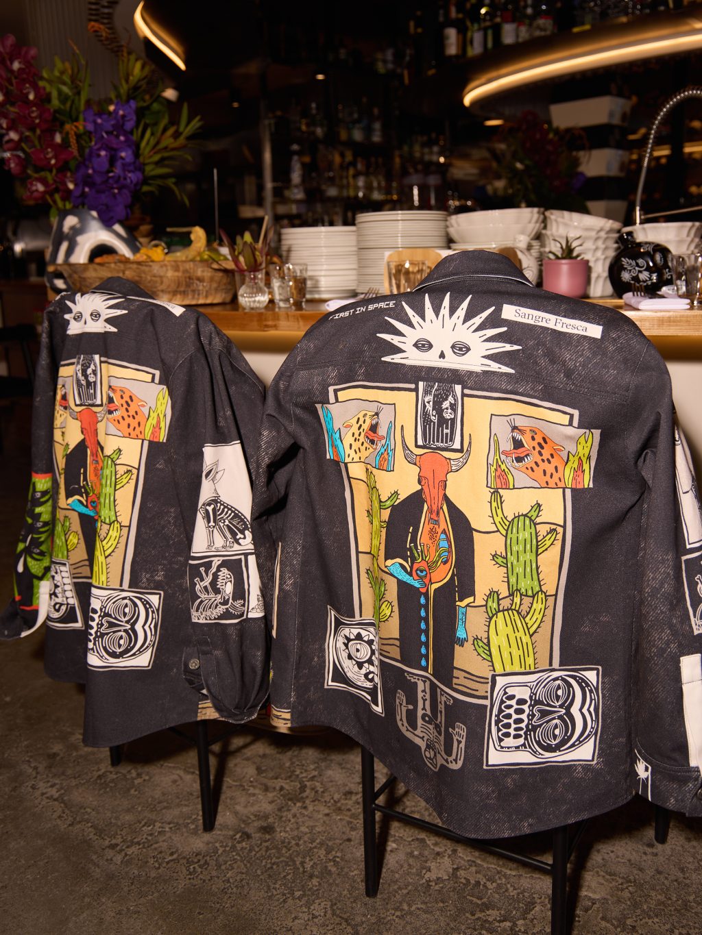 Именно эта внутренняя свобода и совпала с характером Sangre Fresca. Ресторан, в котором мексиканский темперамент соединяется с точностью современной кухни, стал естественной площадкой для диалога. Огромный профессиональный опыт и вечная молодость, хулиганство с перчинкой и уважение к ремеслу — точки соприкосновения оказались очевидными. Команды дали художникам полную свободу, и дизайн вышел по-настоящему жгучим: кактусы, черепа, лучадоры (бойцы мексиканского реслинга lucha libre), огонь, быки, острые перцы. Шкала Сковилла к одежде неприменима, но для этих вещей точно случилось исключение!