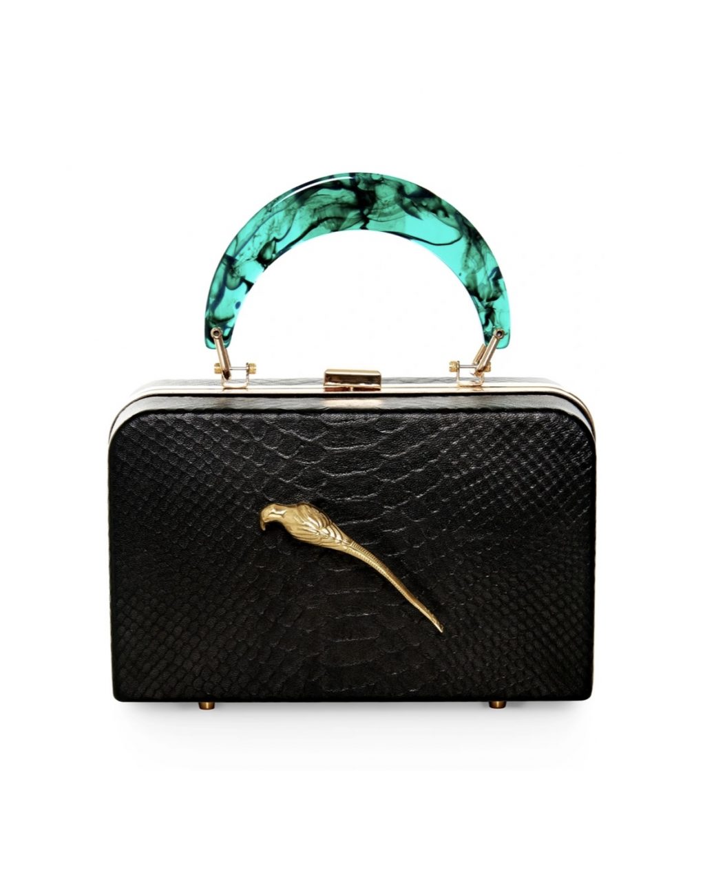 Черный клатч-бокс — как маленькая история в коже: тонкая soft-touch поверхность с тиснением «питон» дарит коже глубокую текстуру, а ручка из малахитового дымчатого акрила добавляет неожиданный благородный акцент. Сочетание чёрного, зелёного и золота здесь работает как финальный штрих — утончённый, но заметный, идеальный для тех, кто любит, чтобы даже самый маленький аксессуар говорил о вкусе громче слов.