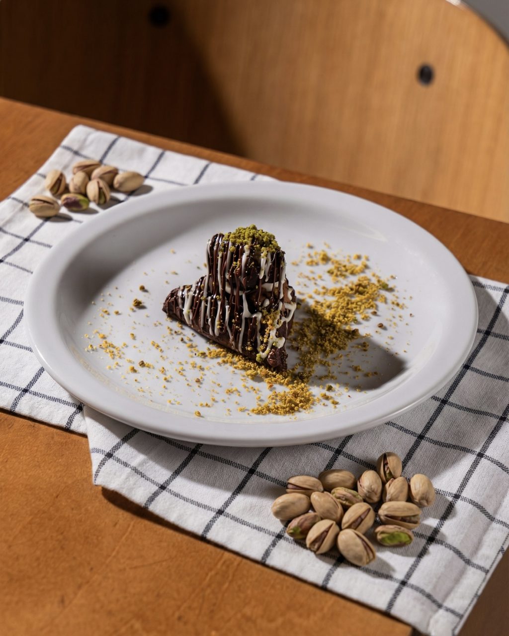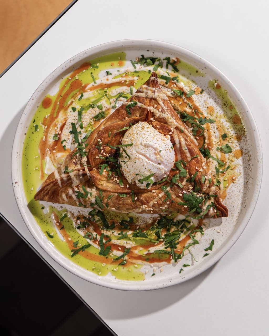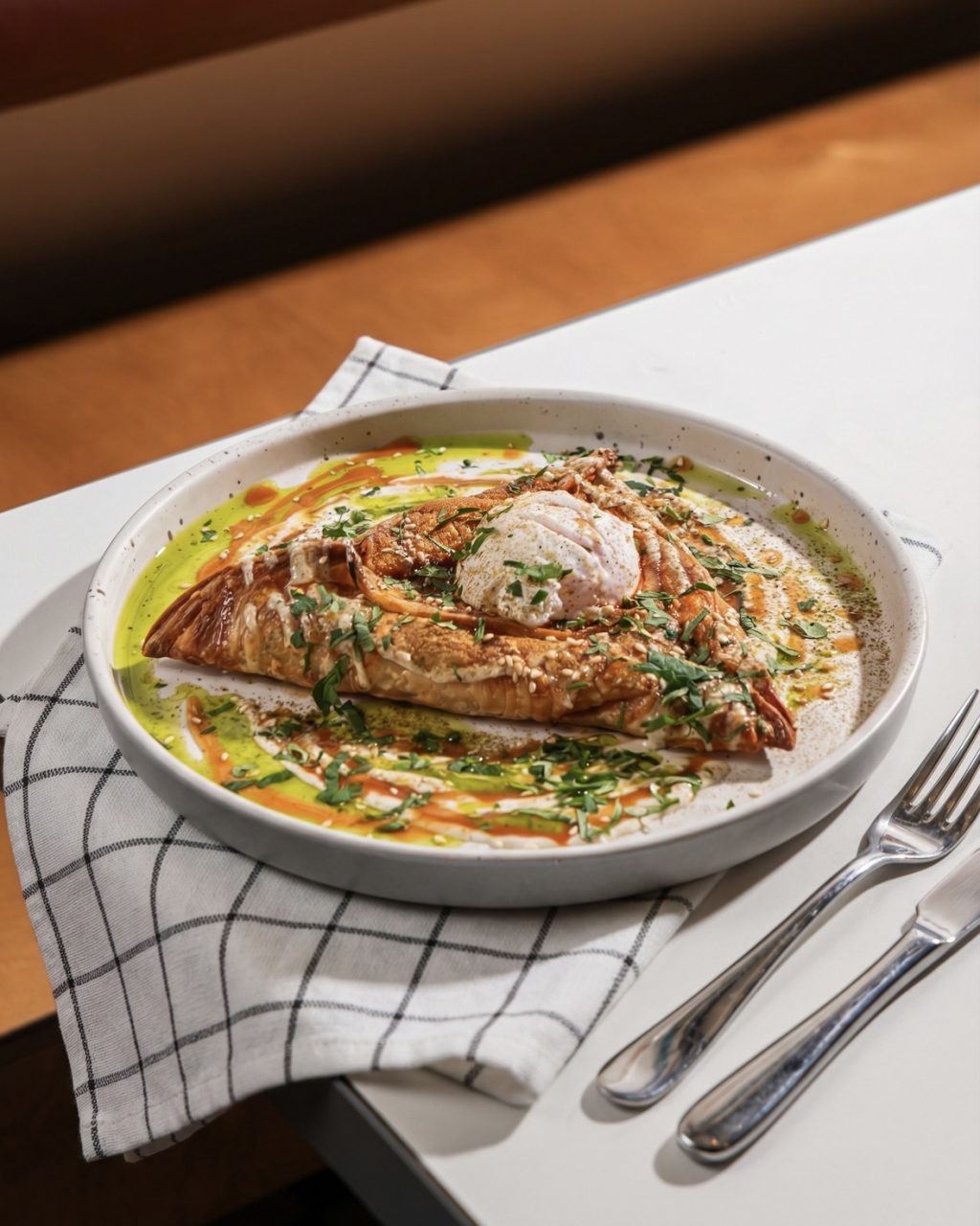 В специальном меню появляется и гастрономический акцент праздника — матбуха «Ухо Амана». Хрустящая лепёшка роти, запечённая в треугольной форме, наполнена томатной матбухой и тянущейся моцареллой. Внутри — нежное яйцо пашот, сверху — кремовая тхина, ароматное масло кинзы, заатар и кунжут. Блюдо получается многослойным, сочным и пряным — с характерным ближневосточным темпераментом.