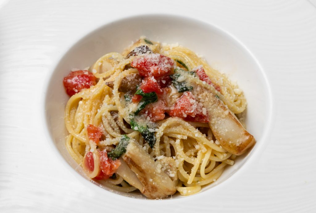 Главная звезда — тыквенный суп с копченым угрем и креметте (690 ₽), где бархатистый цвет и насыщенный вкус дополняются пикантной фисташковой крошкой и оливковым маслом. Любителям грибов адресован сезонный хит — спагетти с белыми грибами и томатами (890 ₽), раскрывающие лесную сладость вместе с лёгкой кислинкой.