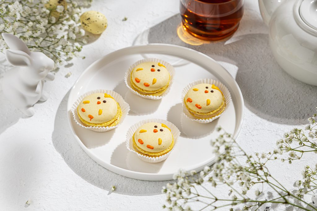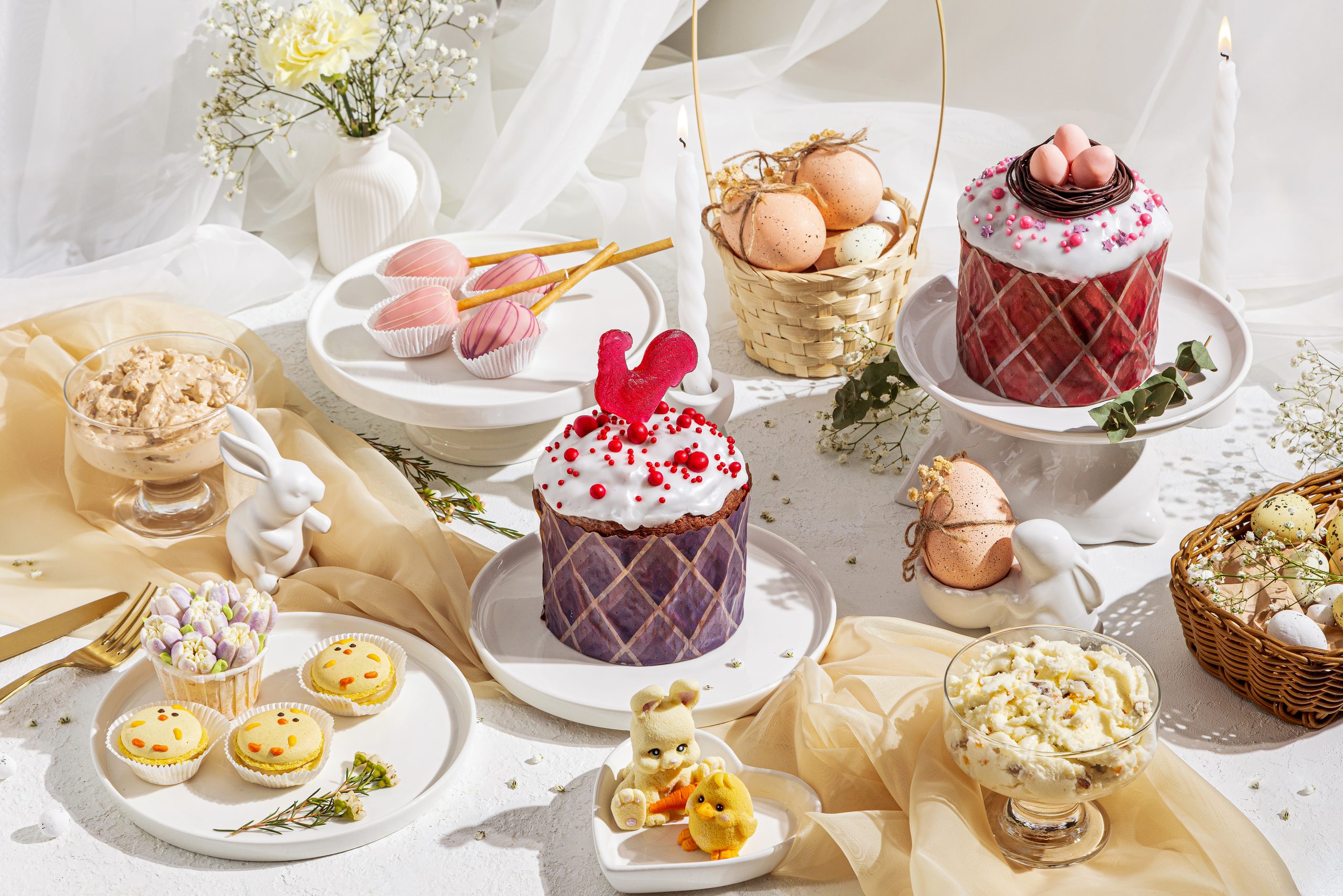 В пасхальном меню есть и небольшие десерты, которые легко становятся приятным подарком. Кейк-попсы (129 р.) с глазурью из белого шоколада и насыщенным шоколадным бисквитом внутри, макарон «Птенчик» (99 р.) с лимонной начинкой, а также набор «Светлой Пасхи» (1960 р.) с мини-бенто-тортом и пятью капкейками, украшенными вручную кремовыми цветами.