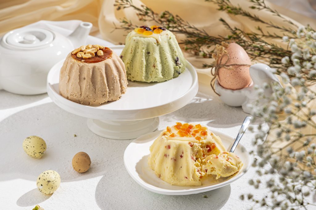Особое внимание уделено десертным творожным пасхам «МясновЪ По-Царски», которые готовят из натурального творога собственного производства, сливочного масла и сливок. В коллекции представлены несколько вкусовых вариаций: фисташковая (698 р.) с апельсиновыми цукатами и клюквой, белым шоколадом и фисташковым пралине; сливочная с цукатами (490 р.) с шелковистой текстурой благодаря крему англез; а также карамельная с орехами (460 р.) с нотами молочного шоколада, сливочной карамели и арахиса.