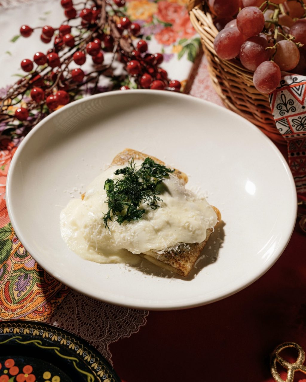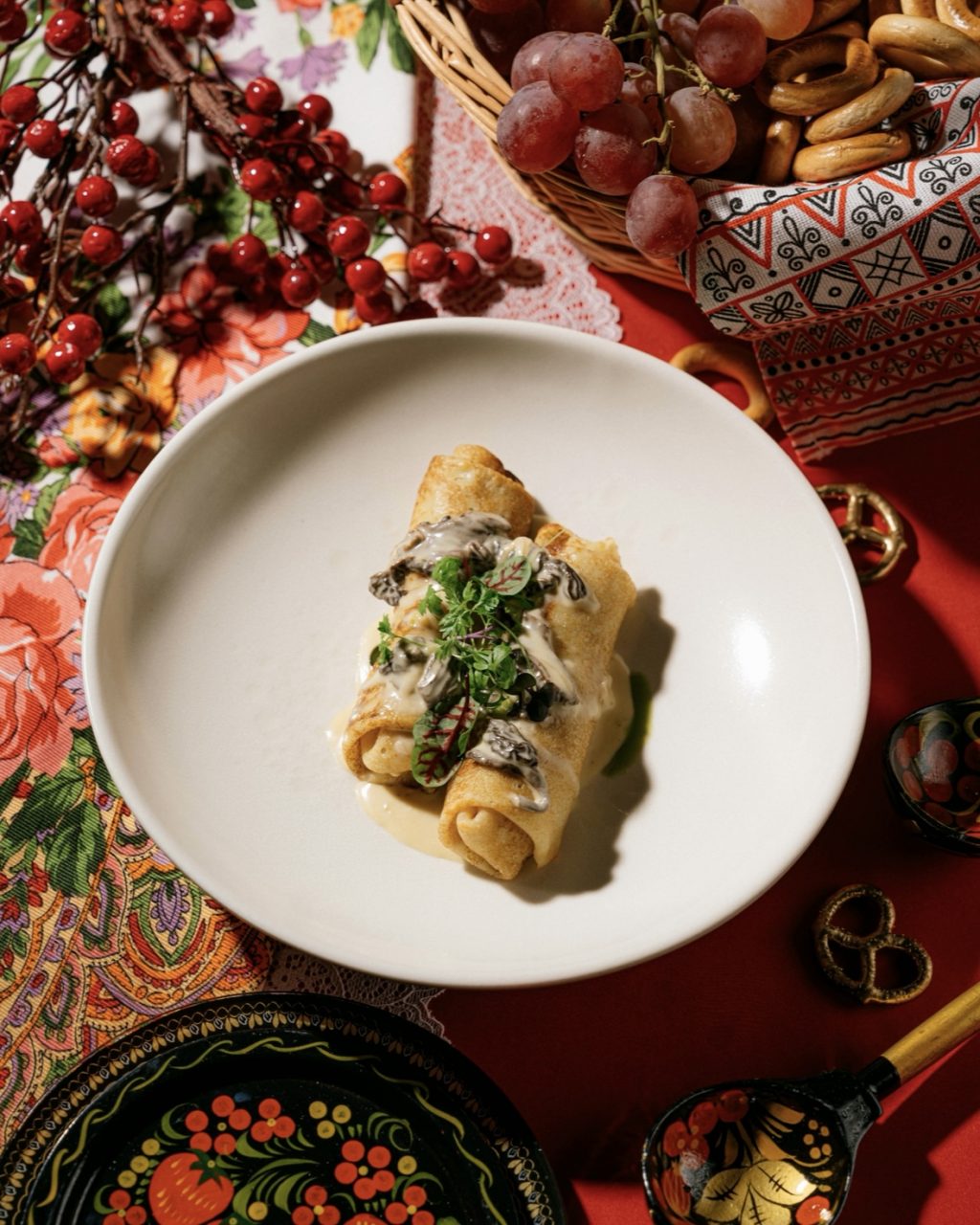 Среди главных позиций — блин с говяжьим фаршем (1 300 руб.): начинка из томлёных су-вид говяжьих рёбер, мусс из пармезана и моцареллы, хрустящая зелень и тёртый Grana Padano. Глубокий мясной вкус с лёгкими дымными нотами делает эту позицию самой сытной в меню.