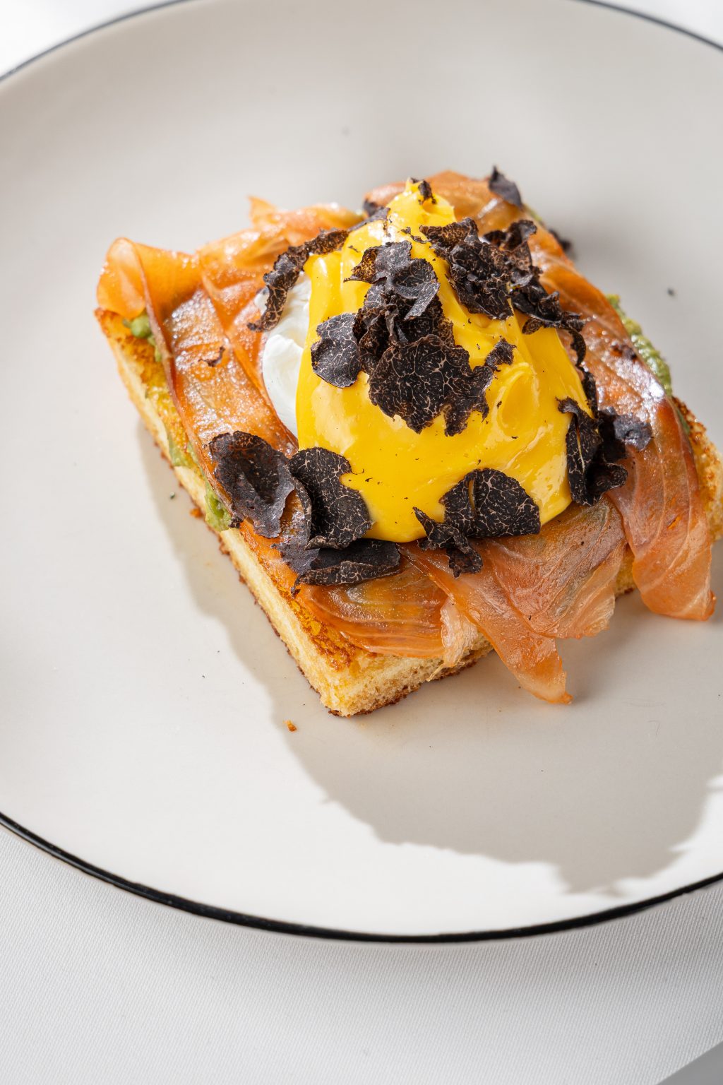 Далее — выбор за гостем. Минимум три дополнения позволяют собрать свою гастрономическую формулу: от лосося, авокадо и яйца пашот до тигровых креветок, мортаделлы и страчателлы — или же уйти в десертное настроение с заварным и шоколадным кремом, малиновым конфитюром и другими акцентами.