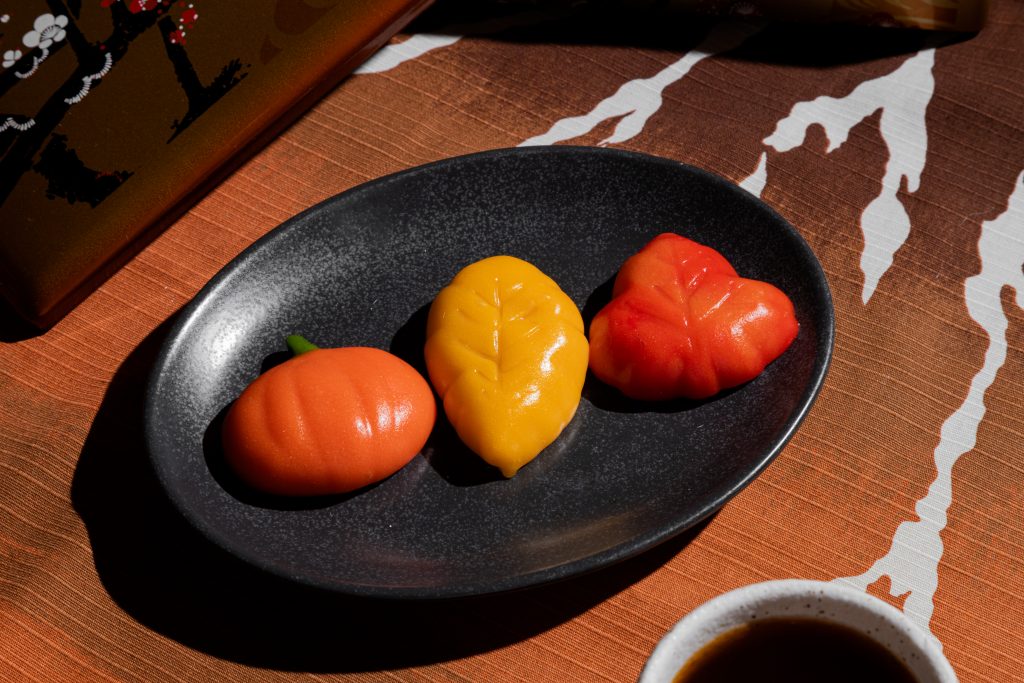 Манго, лимон и брусника — три моти в виде главных символов сезона: тыквы, клена и осеннего листа. Внутри — сладкая паста из красных бобов адзуки.