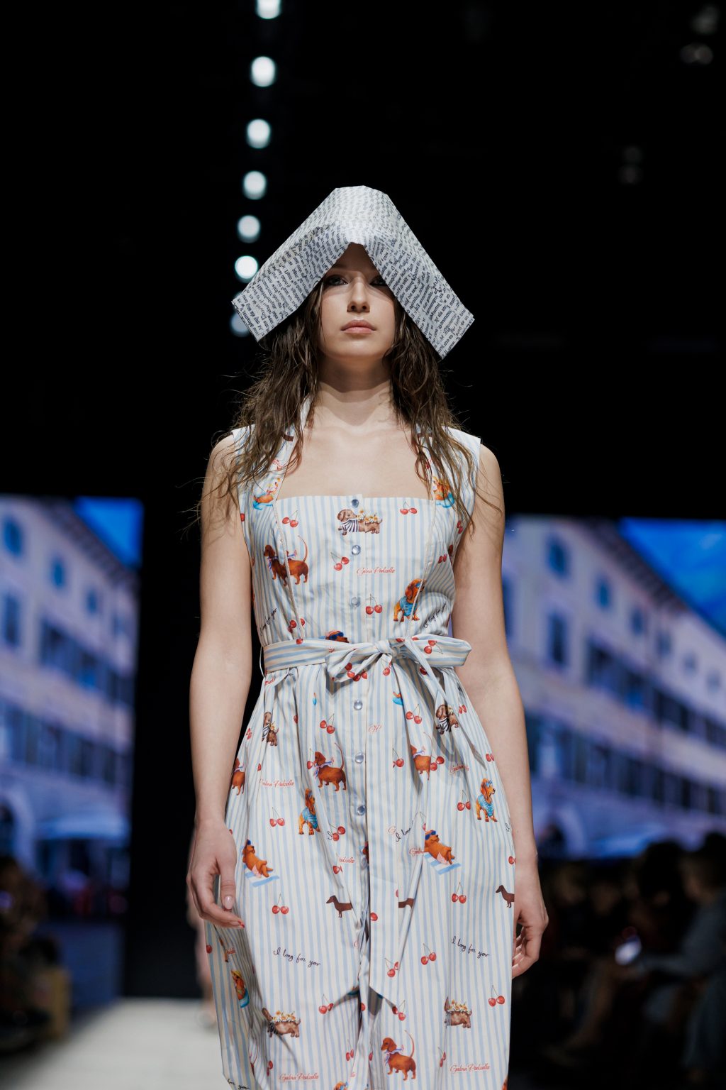 И, конечно, аксессуары. Кораблики — это отдельная история. Мы сделали головные уборы из ткани, но по форме как бумажные. Крахмалили хлопок, чтобы он держал форму. Мне было важно, чтобы это не было просто креативом ради креатива, а чтобы аксессуар можно было носить, чтобы это было живое.