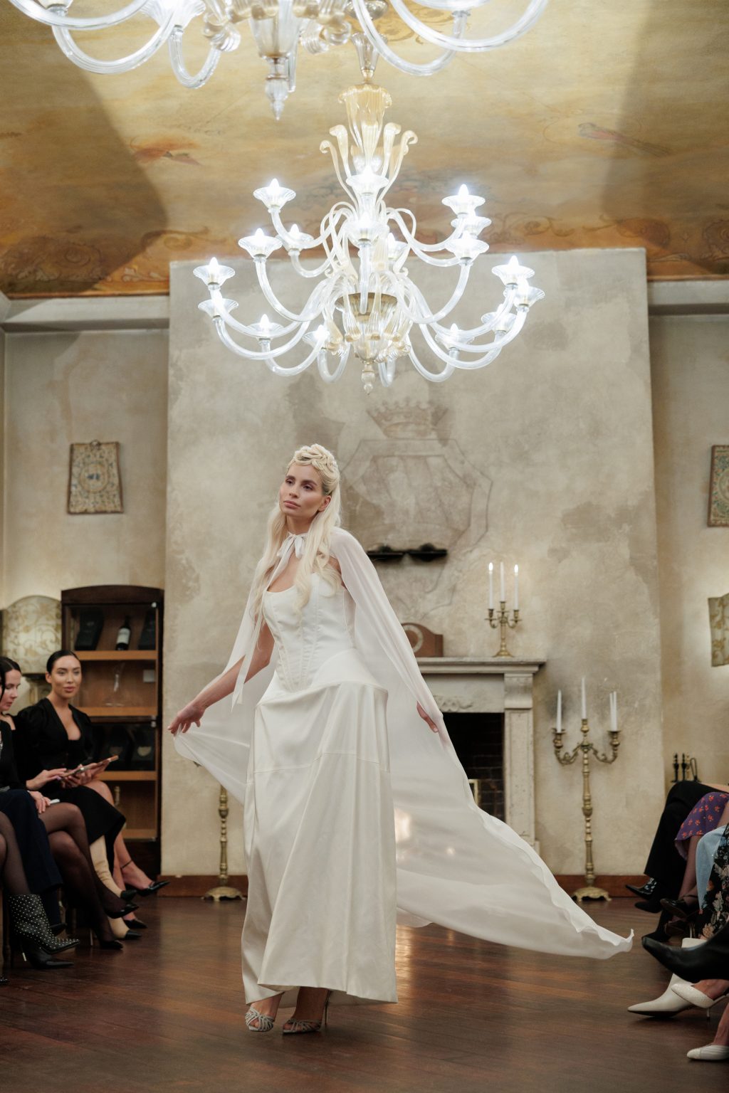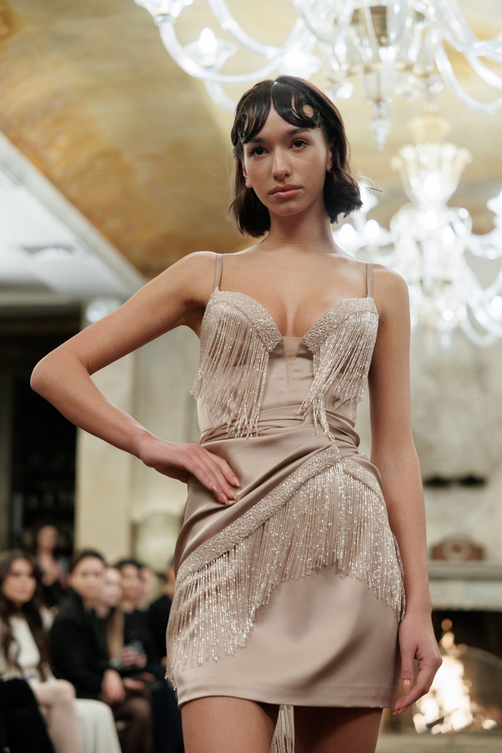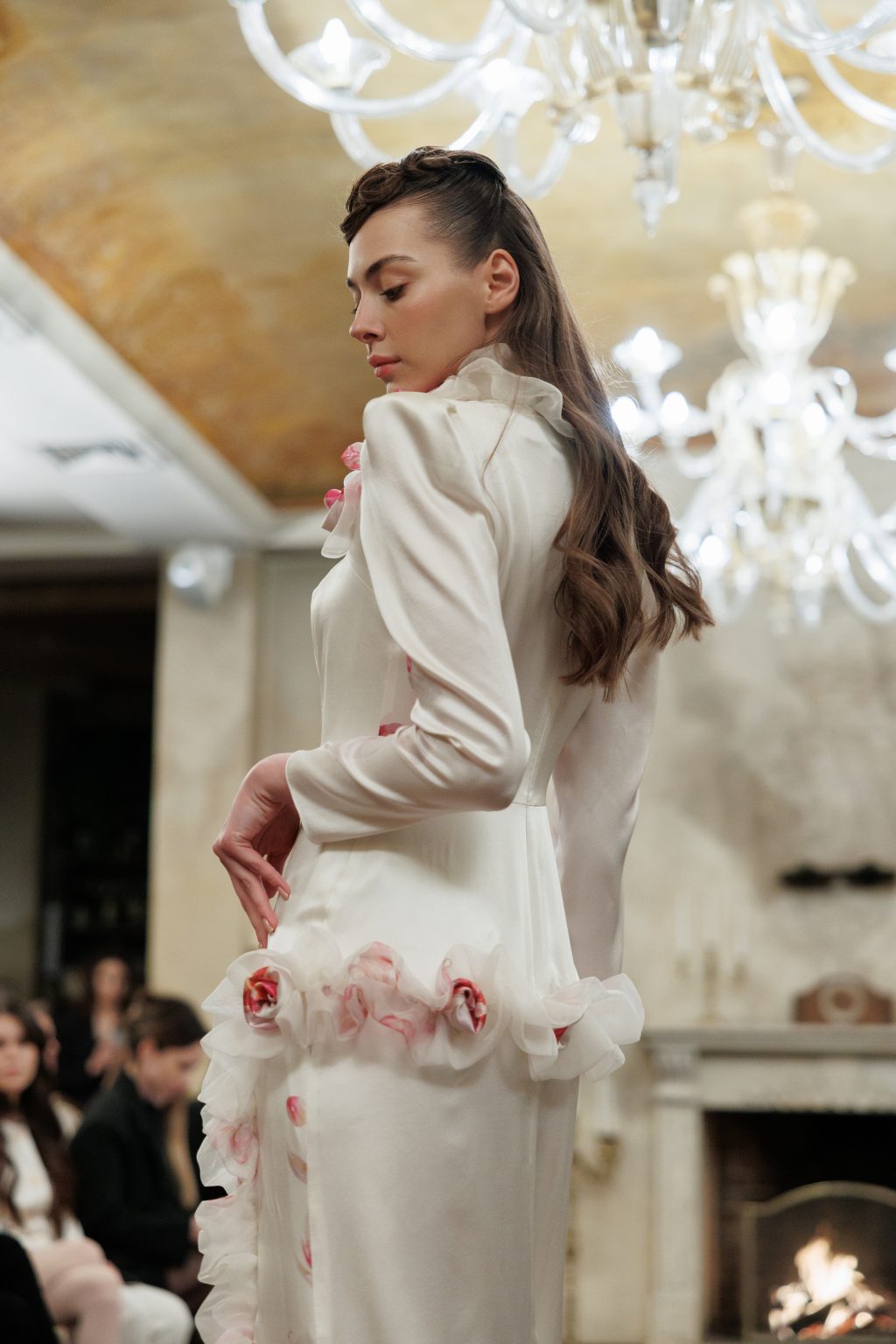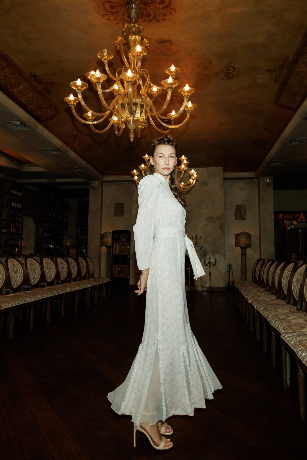 В первую очередь, это осознанная история. Мне важно, чтобы кутюр у меня был не просто вечерний, а с глубиной — и про веру, и про традиции. Чтобы это не было разовая история, а что-то, к чему можно возвращаться, над чем можно думать, что можно долго создавать. Я изучала эту тему и визуальный код, внедряла новые силуэты — закрытые платья, длинные рукава, смысловые принты. Если посмотреть на коллекцию, она получилась очень нежная. Возникает желание эту девушку обнять и защитить. Она как будто первозданная, чистая.