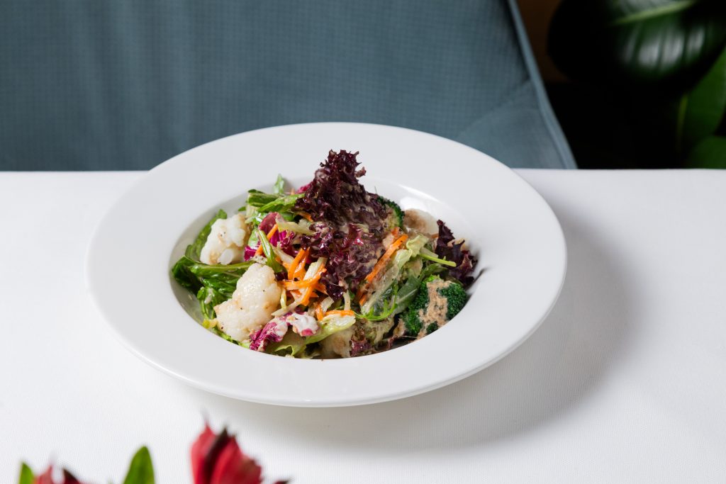 Отличный пример — закуски. Овощной салат с имбирной заправкой (550 руб.) — микс салатных листьев, морковь, сельдерей, кабачок, цветная капуста и брокколи — заправлен имбирной заправкой с нотами не только имбиря, но и чеснока, с паназиатскими мотивами.