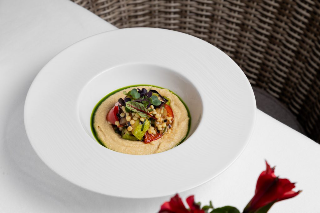 Из трендовой ближневосточной кухни в постное меню «пришел» хумус с печеными овощами (490 руб.). Приготовленный из нута, кунжутной пасты и оливкового масла с чесноком, он подается со свежим салатом из кабачка, томатов, баклажанов гриль, мяты и кинзы с тайским соусом, а также с пастой птимтим с зеленым маслом.