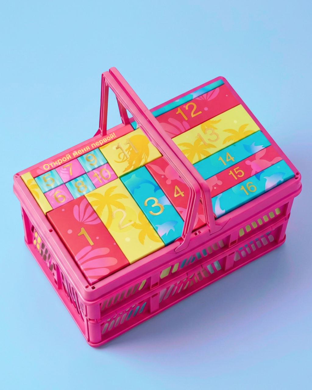 Концепция адвента обращается к образу взрослой девушки с живым внутренним ребёнком — той, которая умеет быть собранной и рациональной, но не отказывается от радости простых вещей. Это ощущение усиливается и через визуальный язык проекта: снаружи — розовая корзина с ботаническими мотивами, почти как объект интерьерного декора; внутри — яркий, насыщенный мир с дельфинами, цветом и лёгкой иронией, создающий дофаминовое настроение.