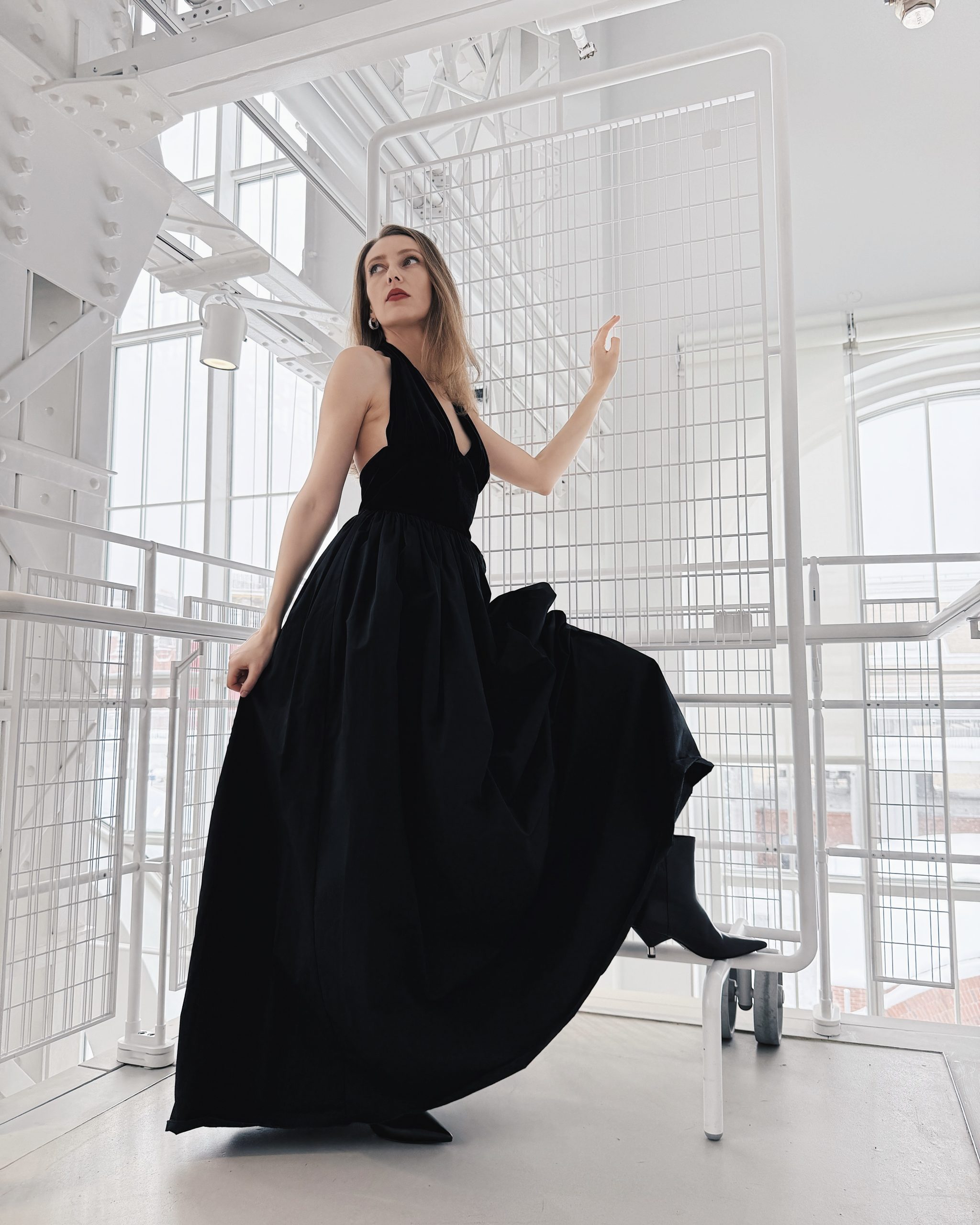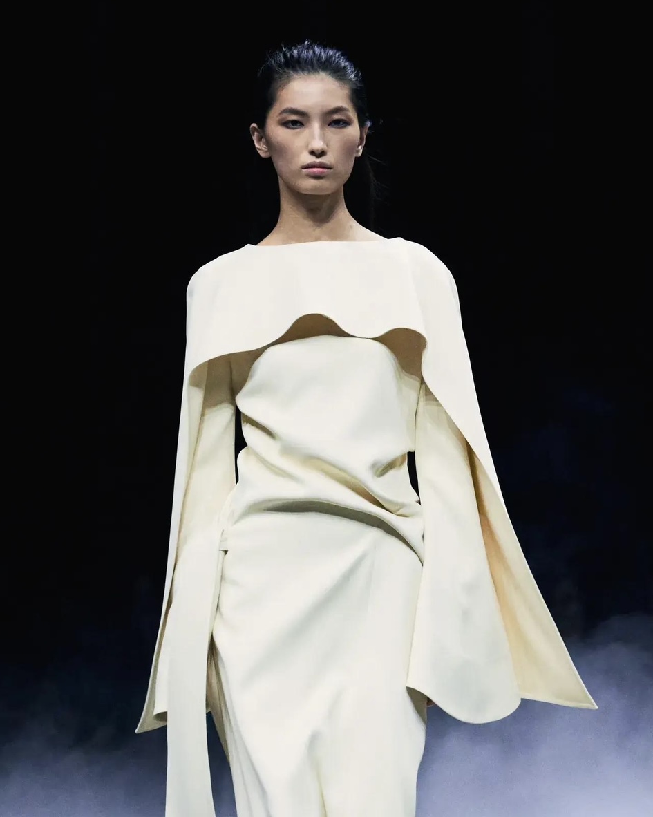В фокусе — вытянутые вертикали, скульптурная линия плеча, обтекаемые формы, создающие ощущение лёгкости. Контраст объёмного верха и узкого низа или наоборот — тонкая игра пропорций, которая формирует динамику без перегруженности. «Выразительность больше не рождается из сложности. Она рождается из пропорций», — объясняет Елена.