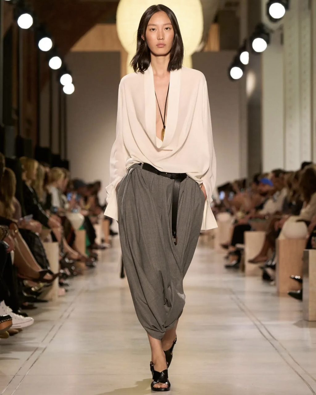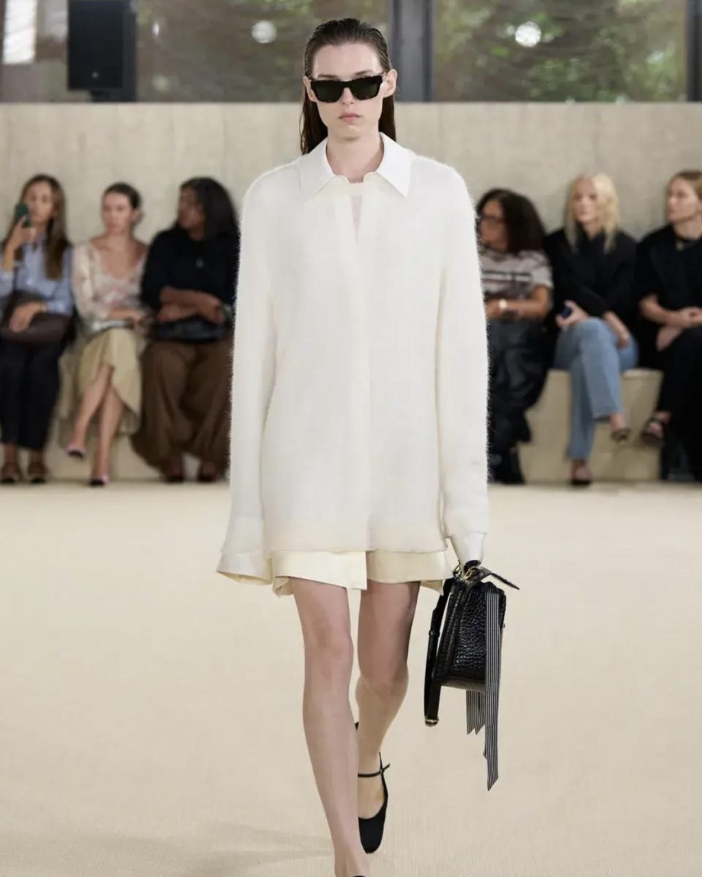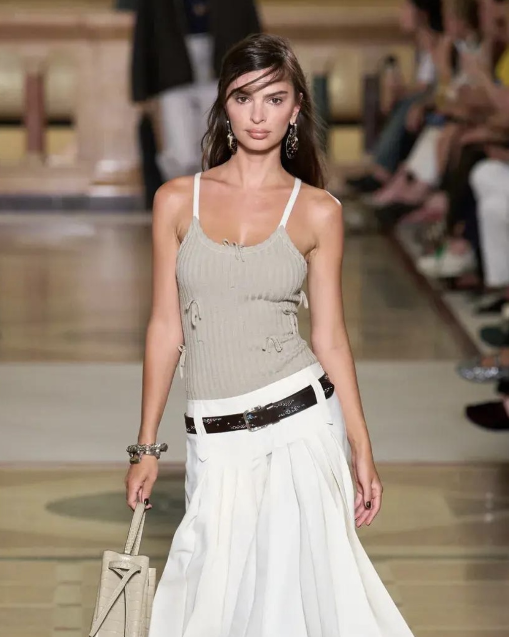 Если внимательно посмотреть на подиумы последних сезонов, этот сдвиг очевиден. У The Row — вытянутые силуэты и скульптурная чистота линий без лишних акцентов, Jil Sander демонстрирует монохромные образы, построенные на фактуре и идеальном крое, а Bottega Veneta поражает мягкой архитектурой плеч и сложными нейтралами вместо контрастных решений. Даже Prada, известная интеллектуальной эксцентрикой, смещает акцент в сторону продуманной простоты и выразительной тишины.