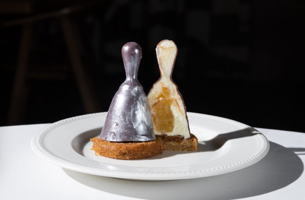 К премьере в сети ресторанов Pinskiy&Co появился десерт от VK Видео (690 руб.) — нежное лакомство в форме колокольчика, символа дуэли в шоу, который можно заказать с 8 октября по 8 ноября. Именно таким звонком колокольчика гости программы вызывают Александра Рогова на игру. В составе десерта – ванильный ганаш с томлеными яблоками и песочным тестом, покрытый шоколадной глазурью, и влажный пряный бисквит с ароматом специй, посыпанный хрустящей вафельной крошкой.