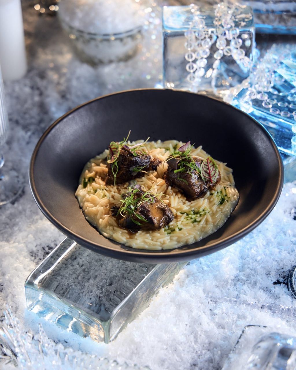 В барной карте — праздничное сопровождение: коктейль New Year’s Ice на джине с вермутом и кордиалом из фейхоа и эстрагона сочетает свежесть и сложный аромат.