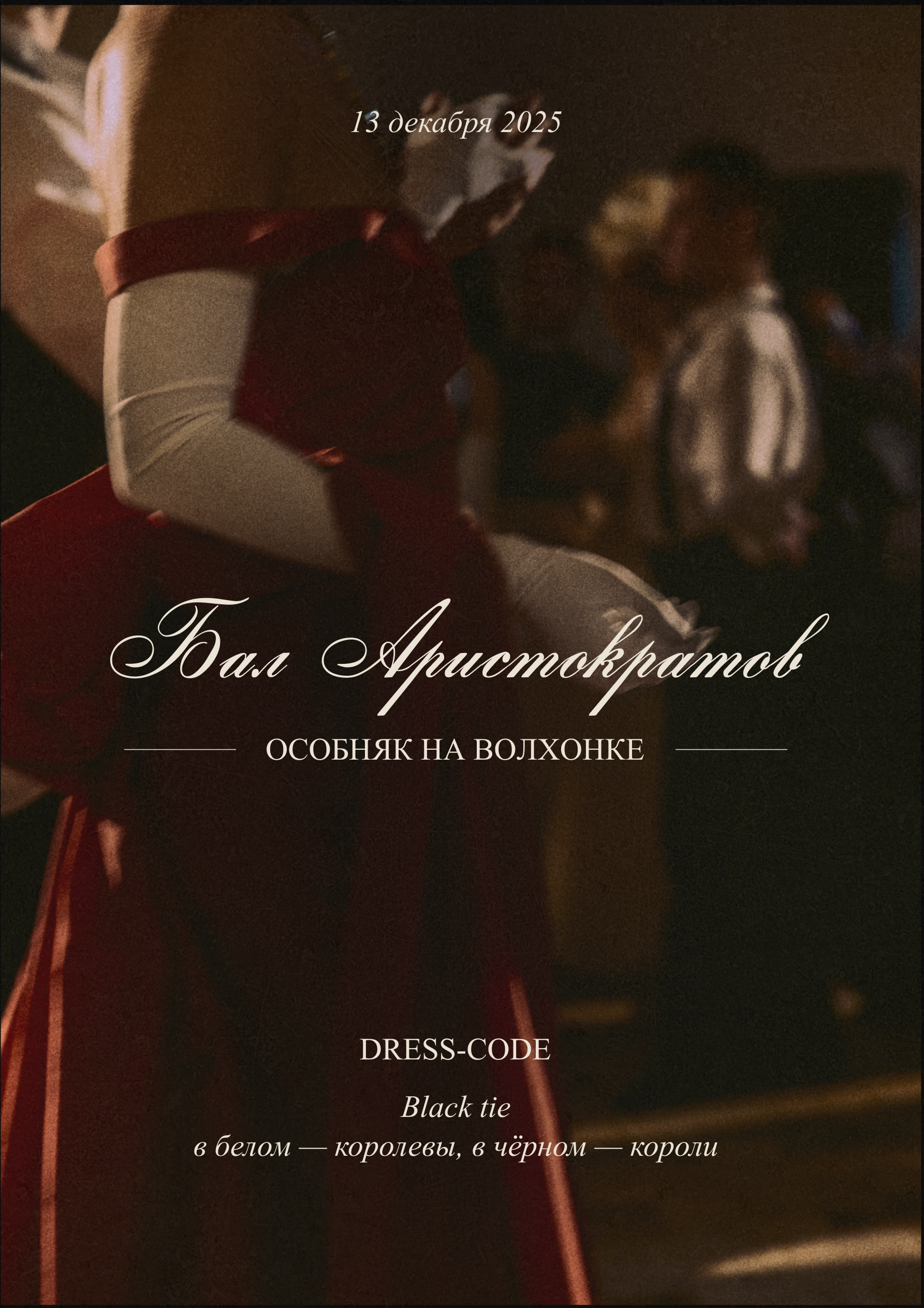 Бал Аристократов — это закрытое событие для ценителей высокой культуры, безупречного стиля и уникального жизненного опыта. Мероприятие объединит на одной площадке представителей креативных индустрий, предпринимателей и знатоков искусства в стремлении возродить культуру изысканного общения и эстетического наслаждения.