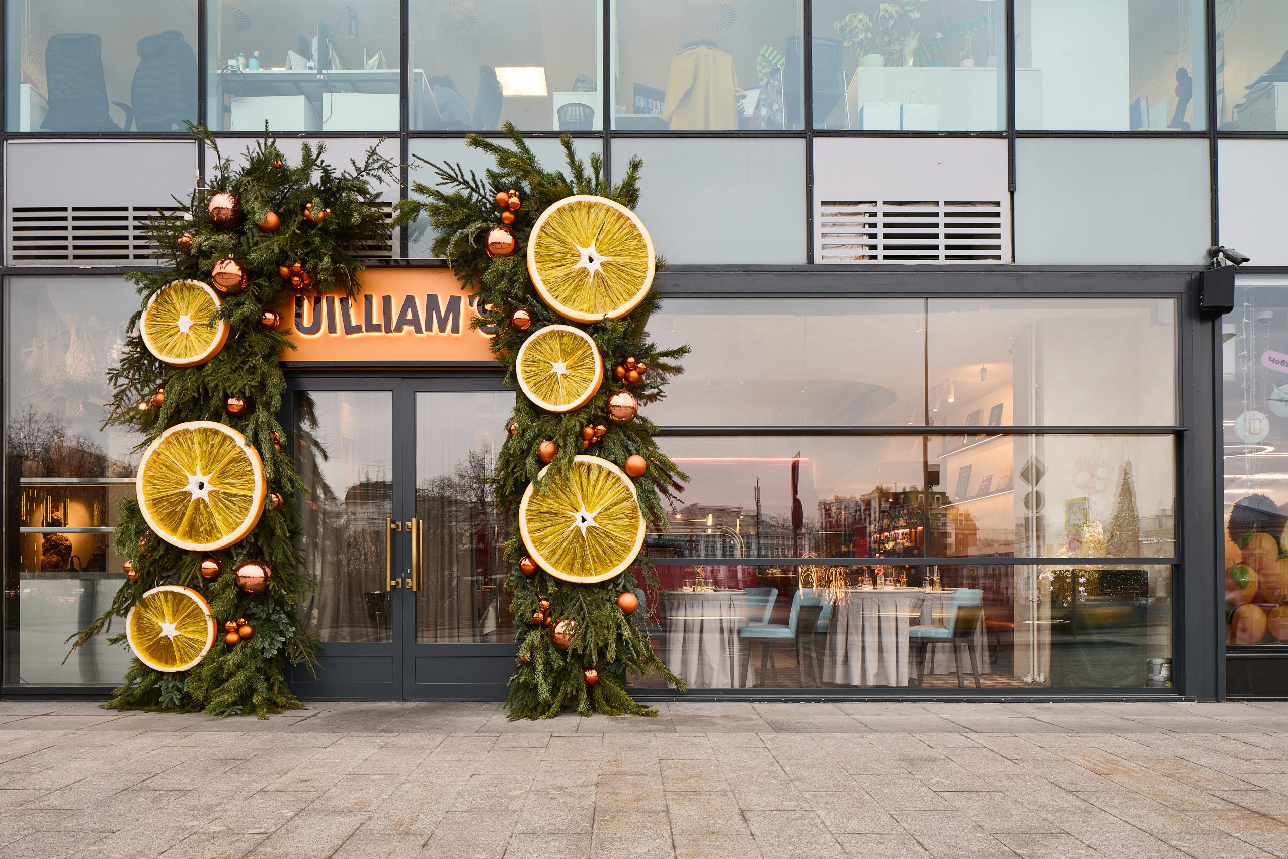 В интерьере UILLIAM’S «видны» черты его предыдущего характера: «состаренные» стены, винтажные столы соскатертями в пол, роспись на потолке, как в старинном итальянском особняке, и изображения самого Уиллиама Ламберти. Это декор украшал фасад первого ресторана на Патриарших, а теперь в обновленном виде предстал на Цветном: 13 фигур Ламберти — для шефа это счастливое число.