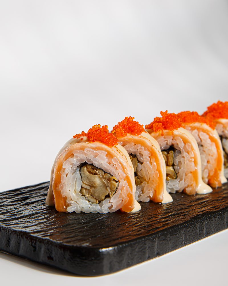 Открывают меню роллы: ролл фуа-гра — опалённый угорь в карамелизированном соусе унаги с сочной начинкой из огурца, авокадо и айсберга и тающим на языке кубиком фуа-гра в клюквенном соусе, ролл морской с тунцом и лососем с начинкой из хрустящей креветки темпура, свежего огурца и соуса унаги, яркий акцент добавляют икра тобико и сливочная шапка из краба и майонеза, ролл с вешенками — дуэт опалённого лосося и жареных вешенок с дымным ароматом в цитрусовом соусе понзу и ролл кимчи с пикантной пекинской капустой и нежным лососем в объятьях белоснежного риса, жгучую глубину блюду добавляет острый соус, превращая каждый укус в маленькую революцию. На кухне Ryba Family это блюдо прозвали огненным поцелуем Востока.
