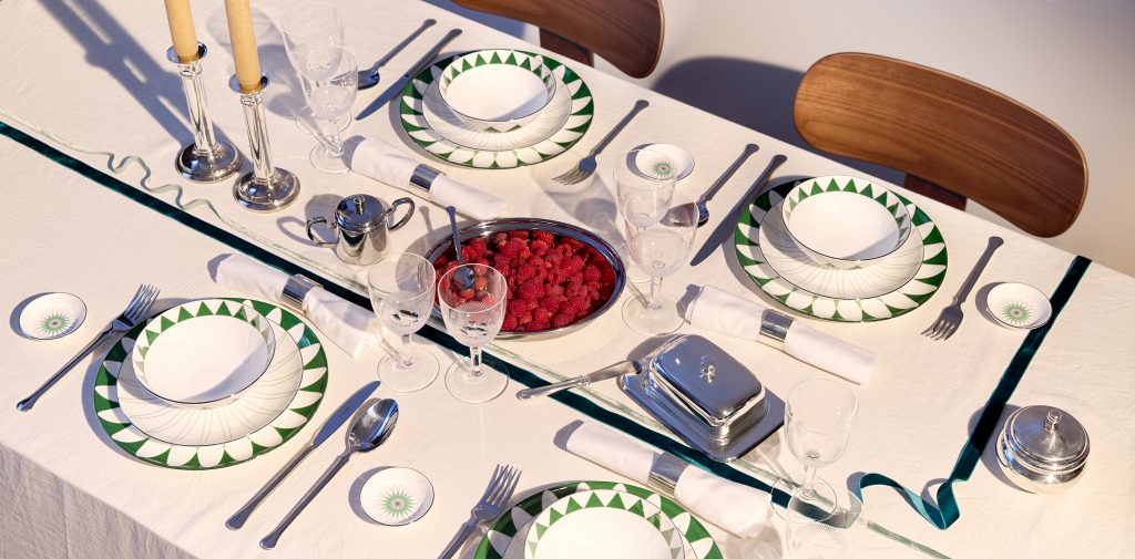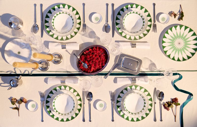 Динамика смены узоров калейдоскопа в декоре стала статичной, сохранив главную идею смены узоров. Каждая тарелка уни-кальна, соединив их все вместе в сервировке, можно запечатлеть, как изумруд-ные, симметричные узоры складываются в один большой. Как и в калейдоскопе, наш путь постоянно меняется, неизменно одно — создание красивого и гармоничного образа.